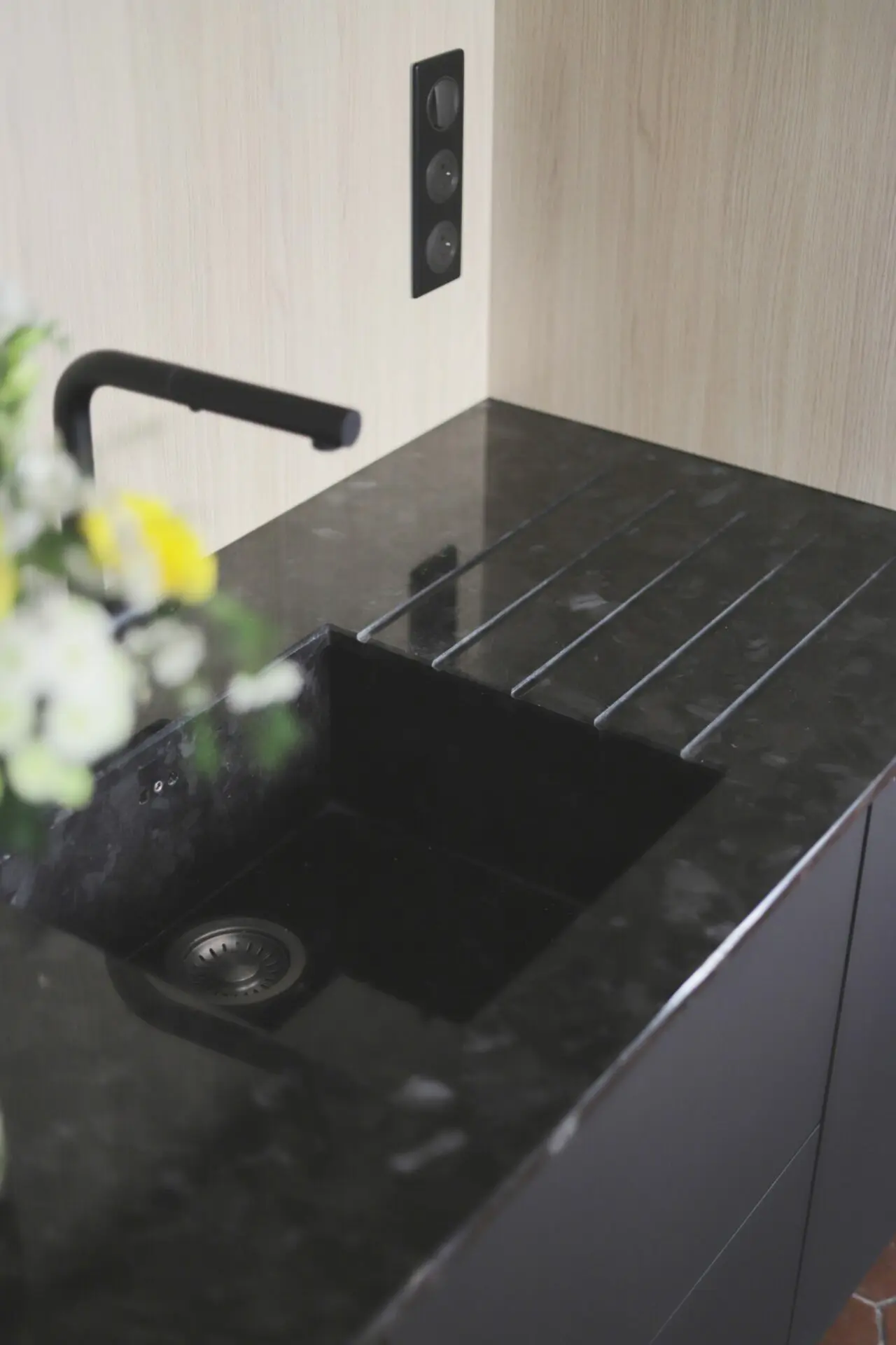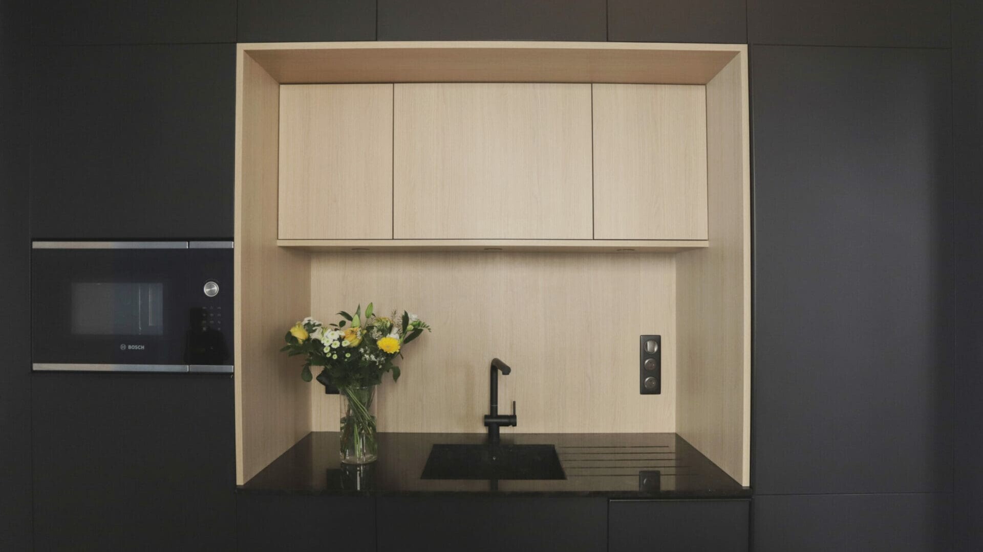 ENJEUX / Rénovation simple mais efficace pour ce studio locatif situé en hyper centre de Dijon. Une première pièce comprend la cuisine et le séjour, et la deuxième fait office de chambre/salon. Des teintes claires ont été choisies pour apporter luminosité et espace. La salle de bain, centrale, apporte une touche plus décorative à l’appartement.
