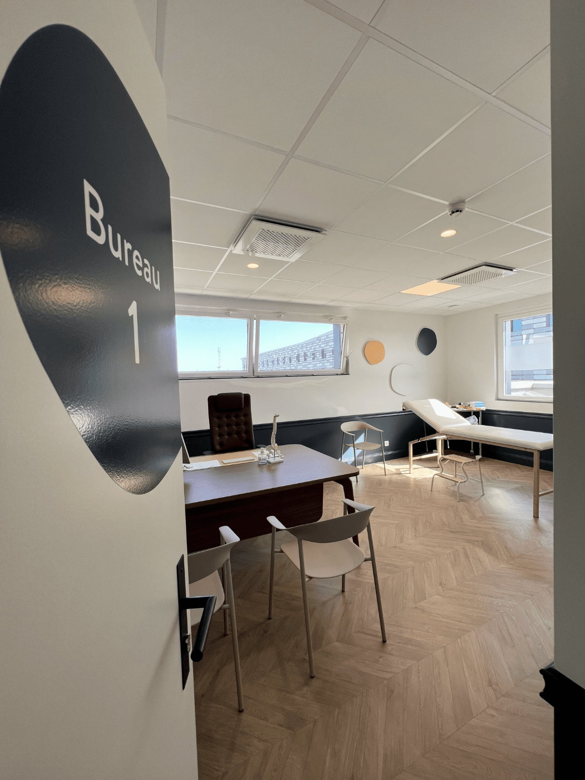 Nous avons joué sur les formes faisant écho à la colonne vertébrale à travers des décors muraux et une verrière unique en angle qui cloisonne la salle d’attente.