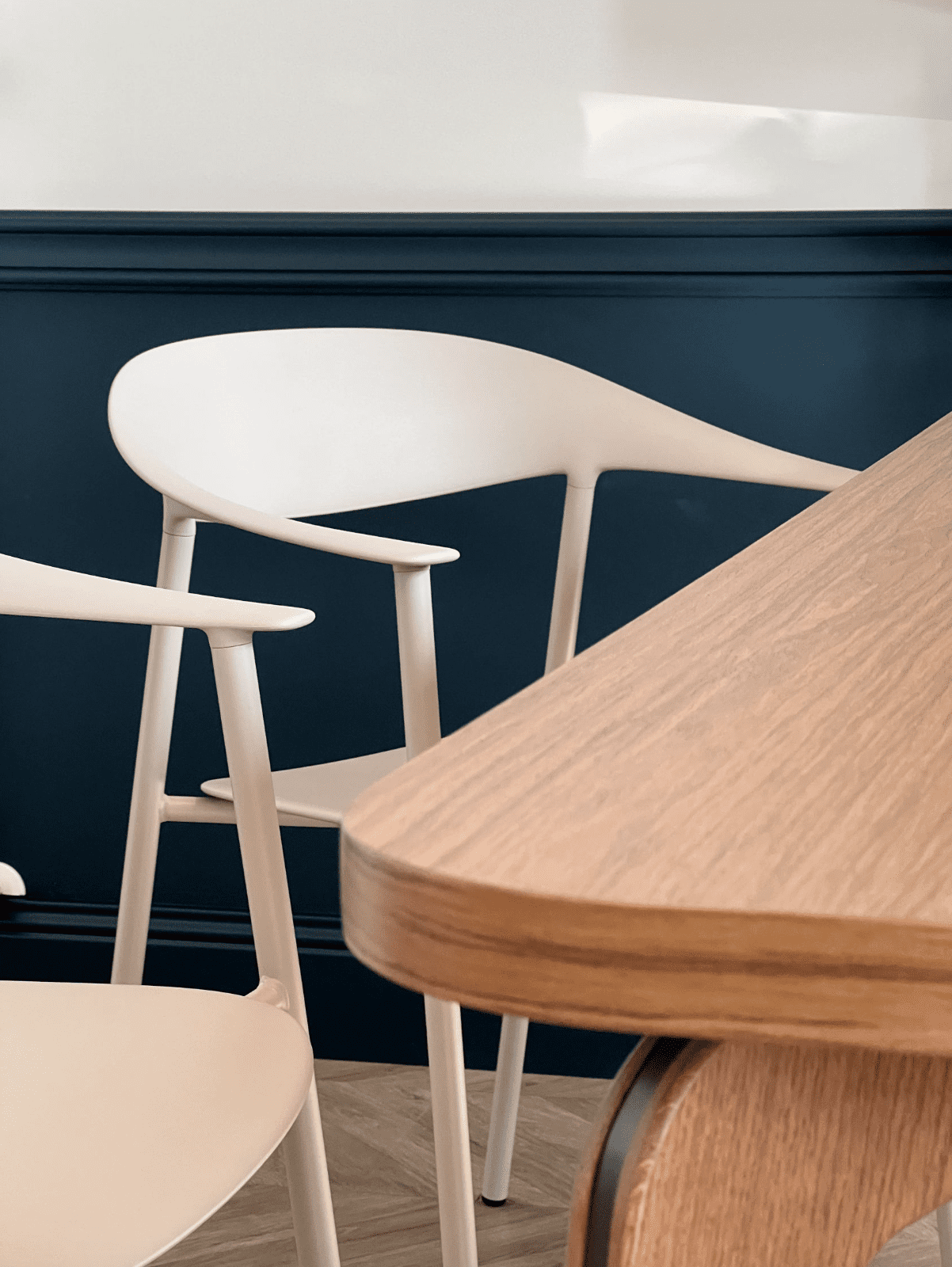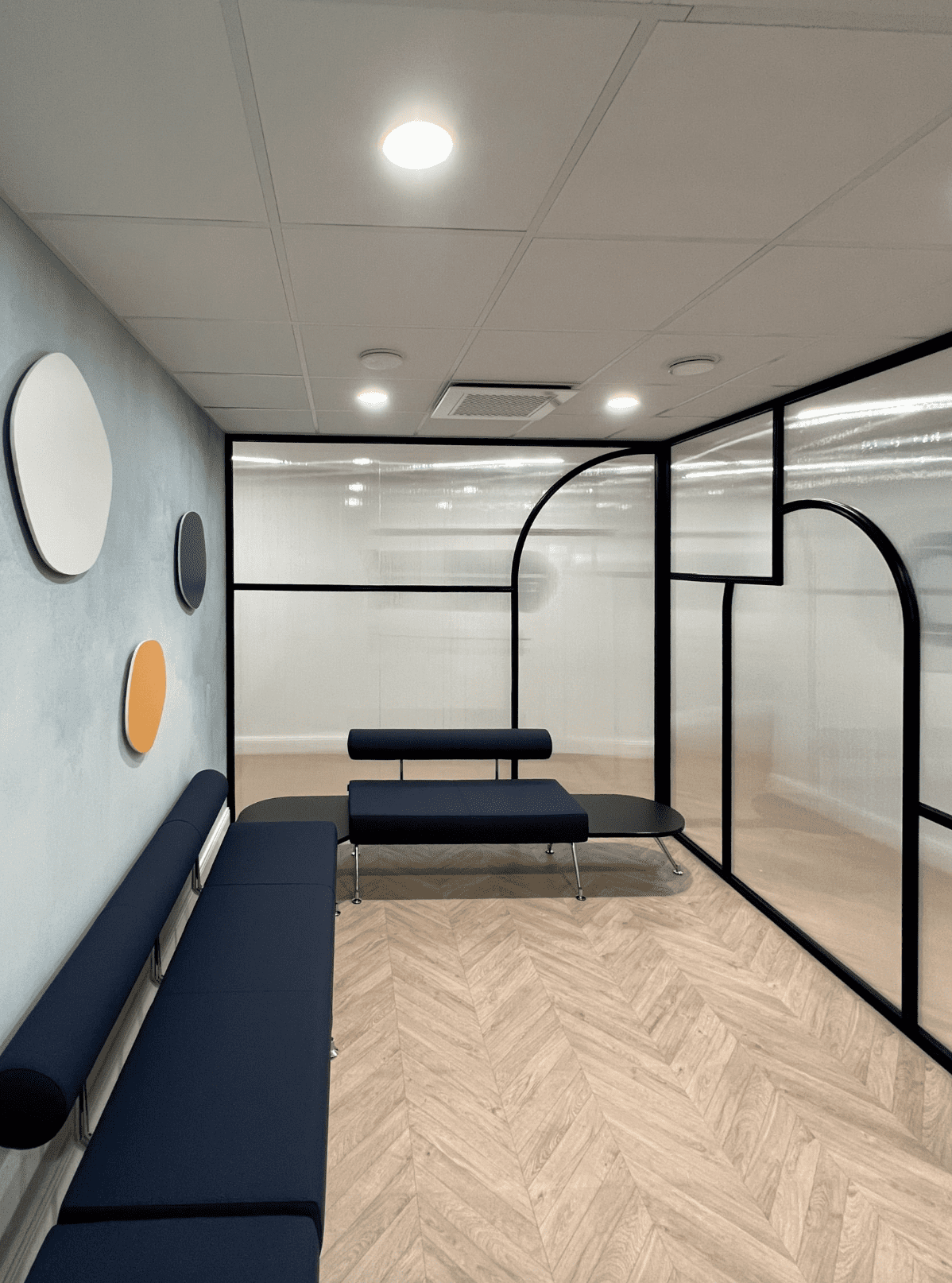 Un bleu profond, des cimaises et une sol effet parquet chevrons revoient à des codes chics et haut de gamme, donnant un coté sophistiqué à ce cabinet médical.