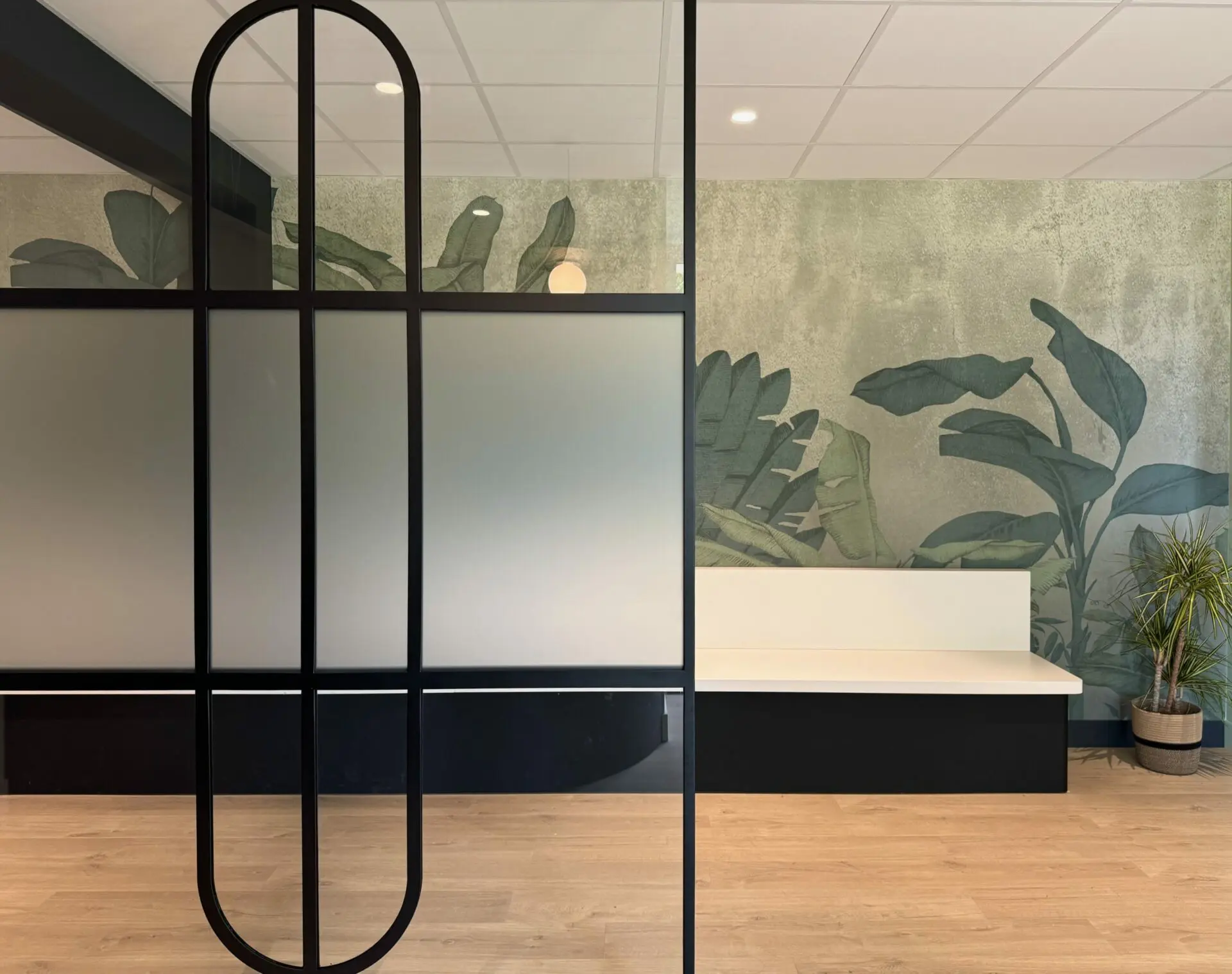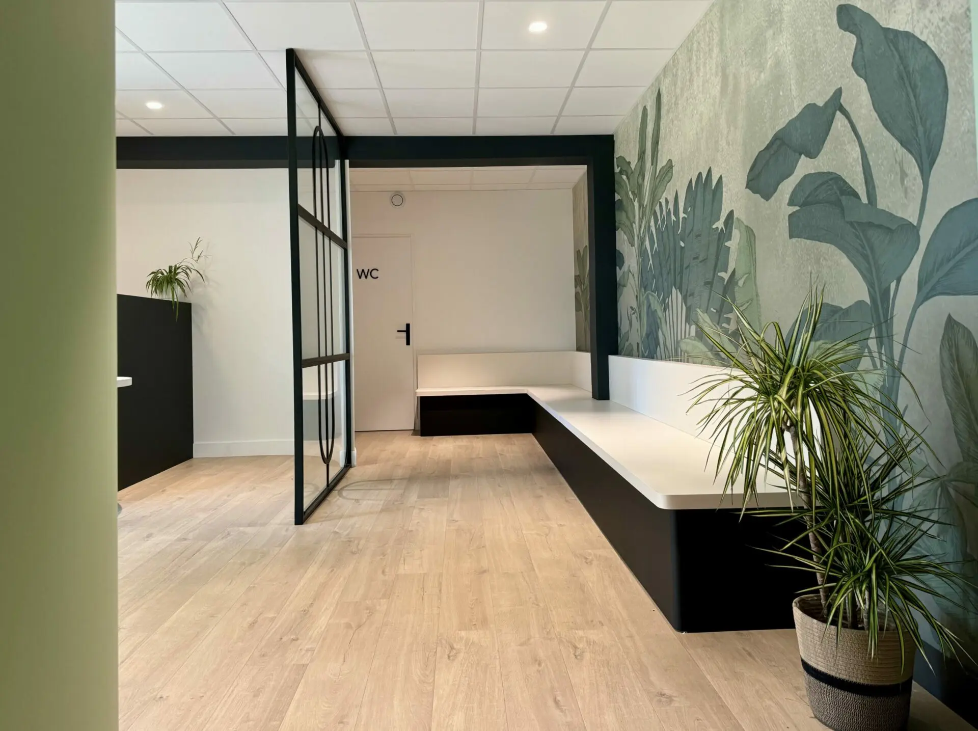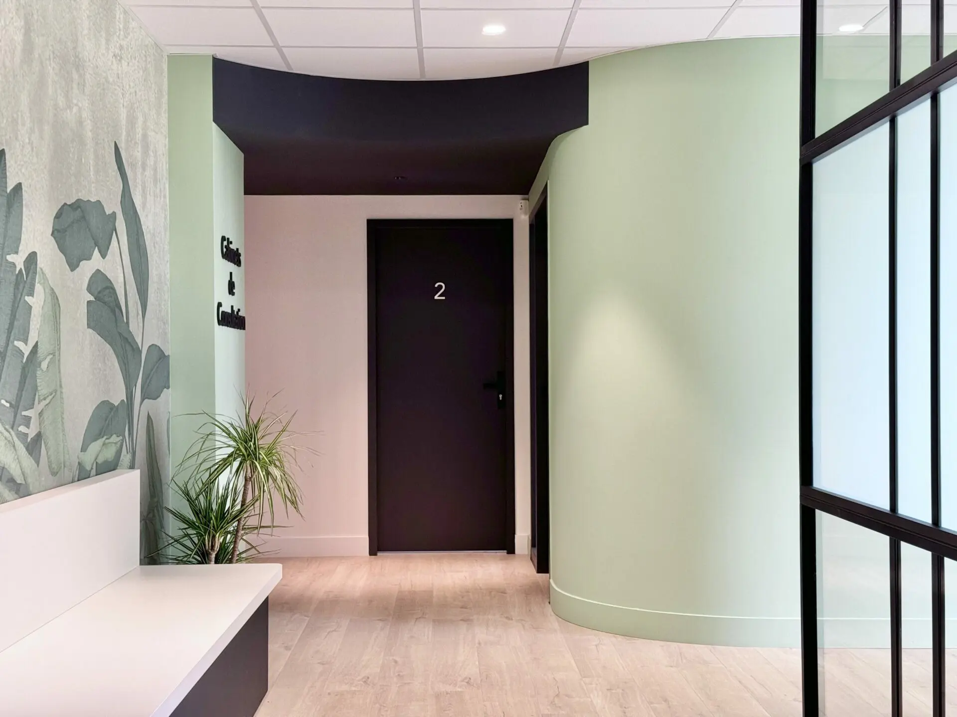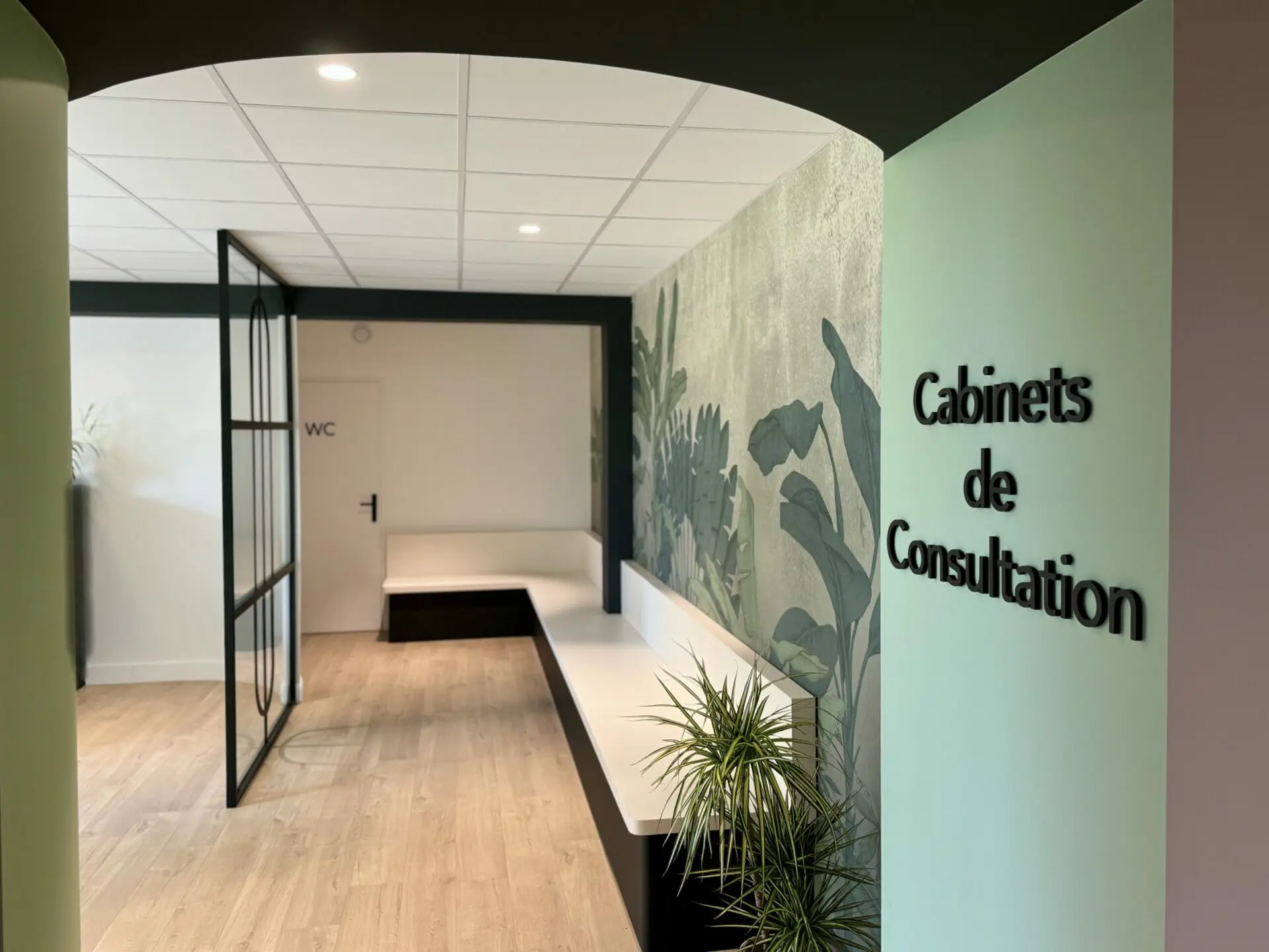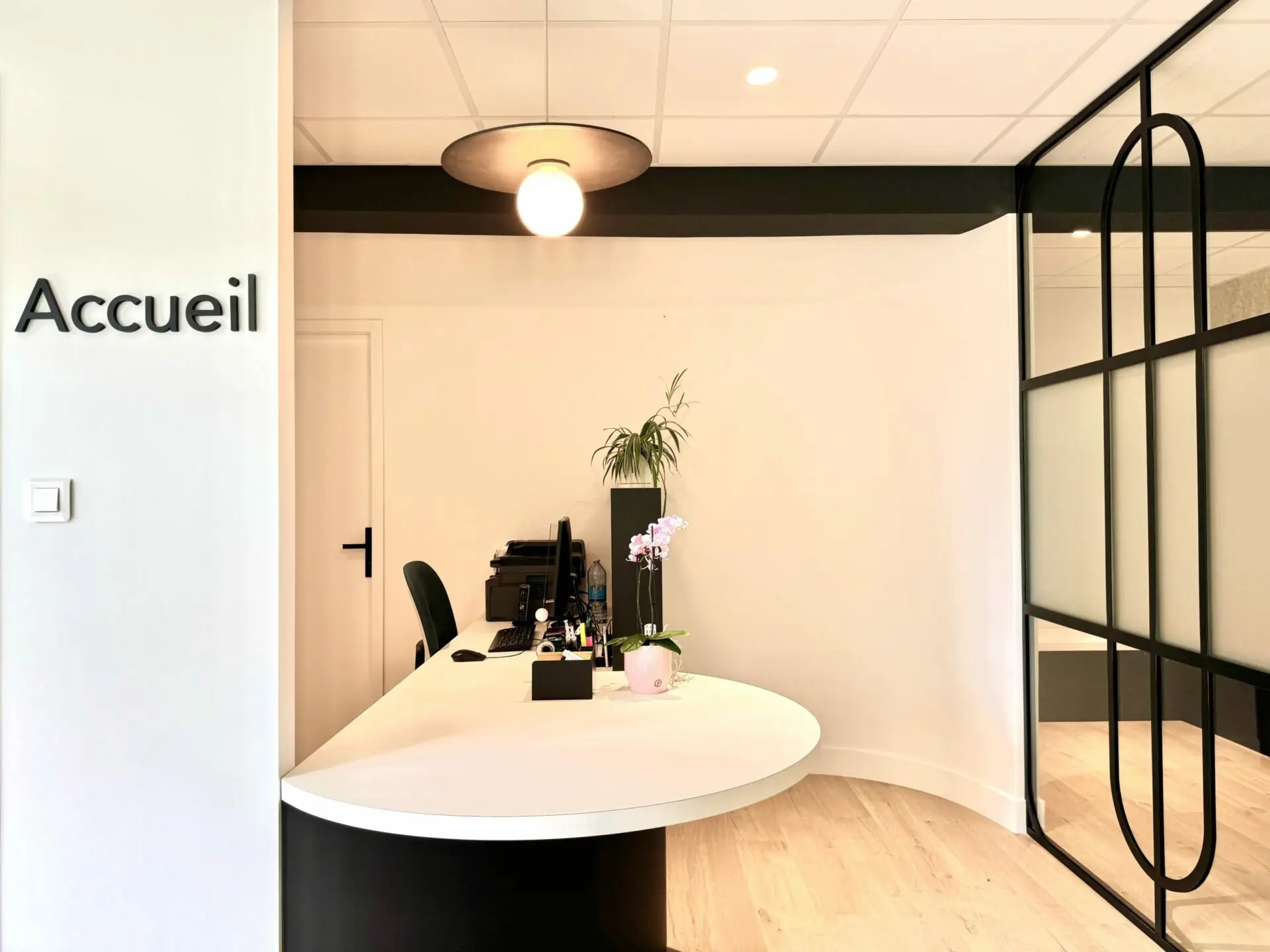 Quelques touches de noir avec une verrière sur mesure, la mise en valeur des poteaux et des poutre et la signalétique revoient à des codes modernes, donnant du caractère à ce cabinet médical.
