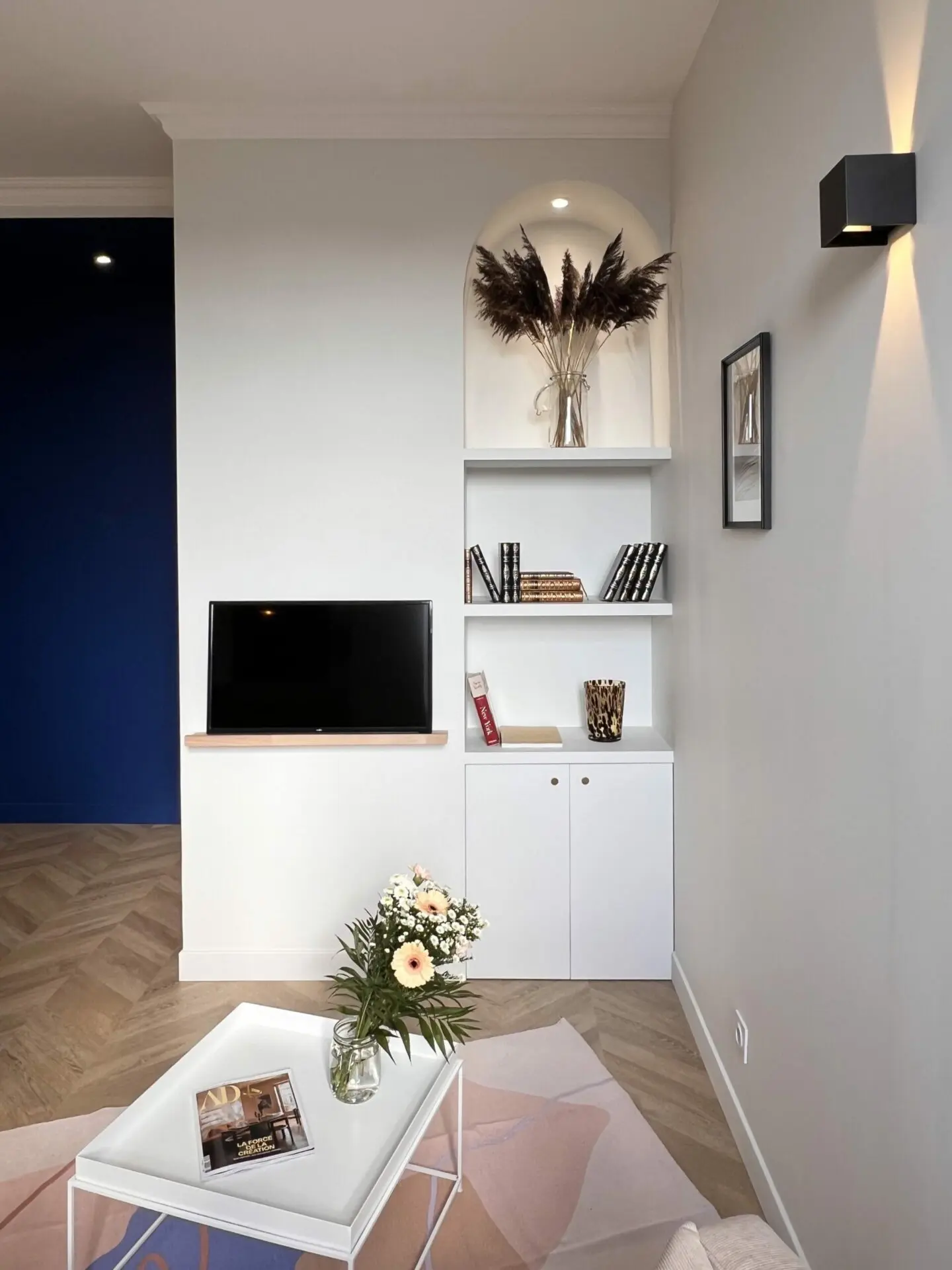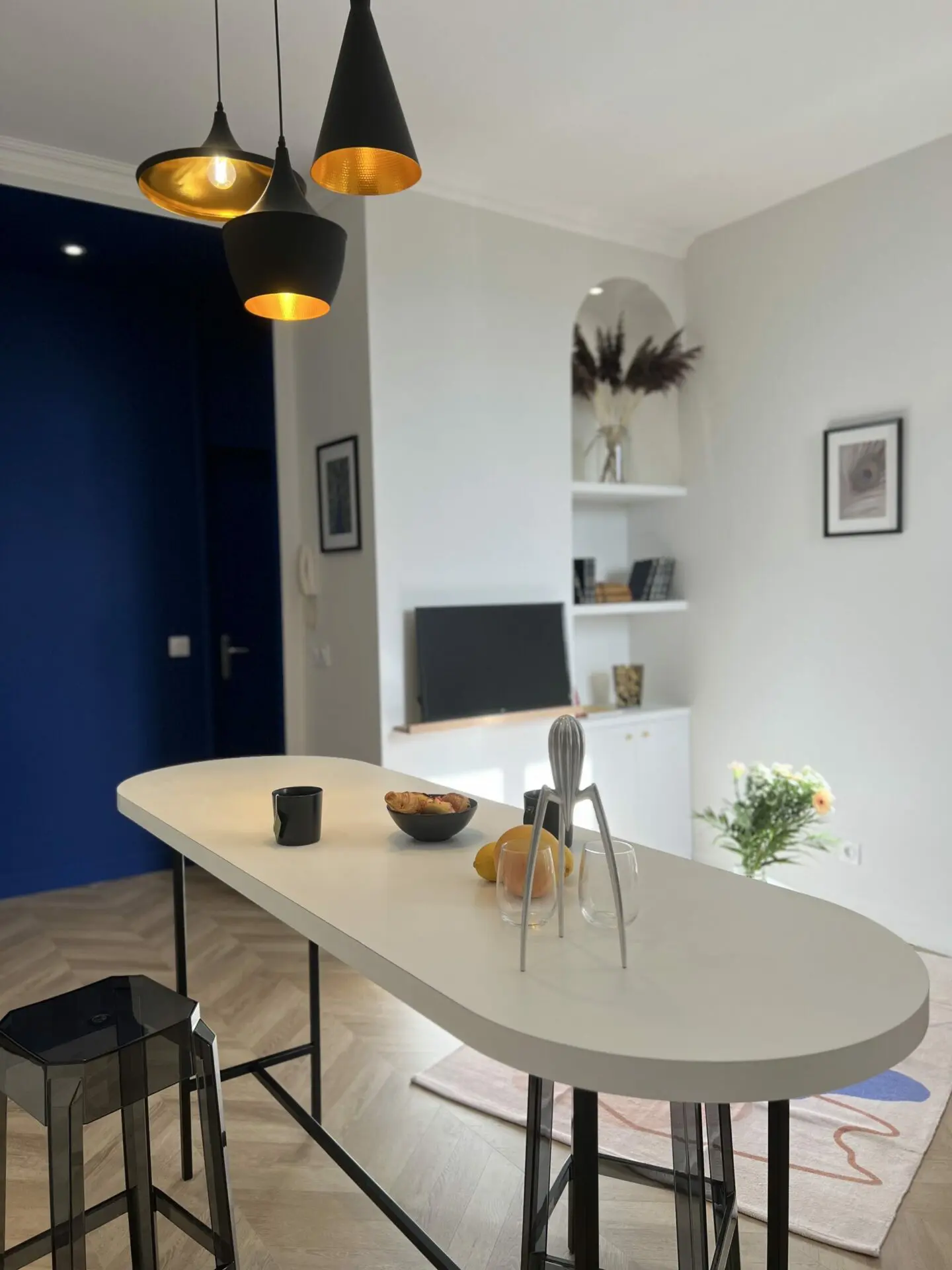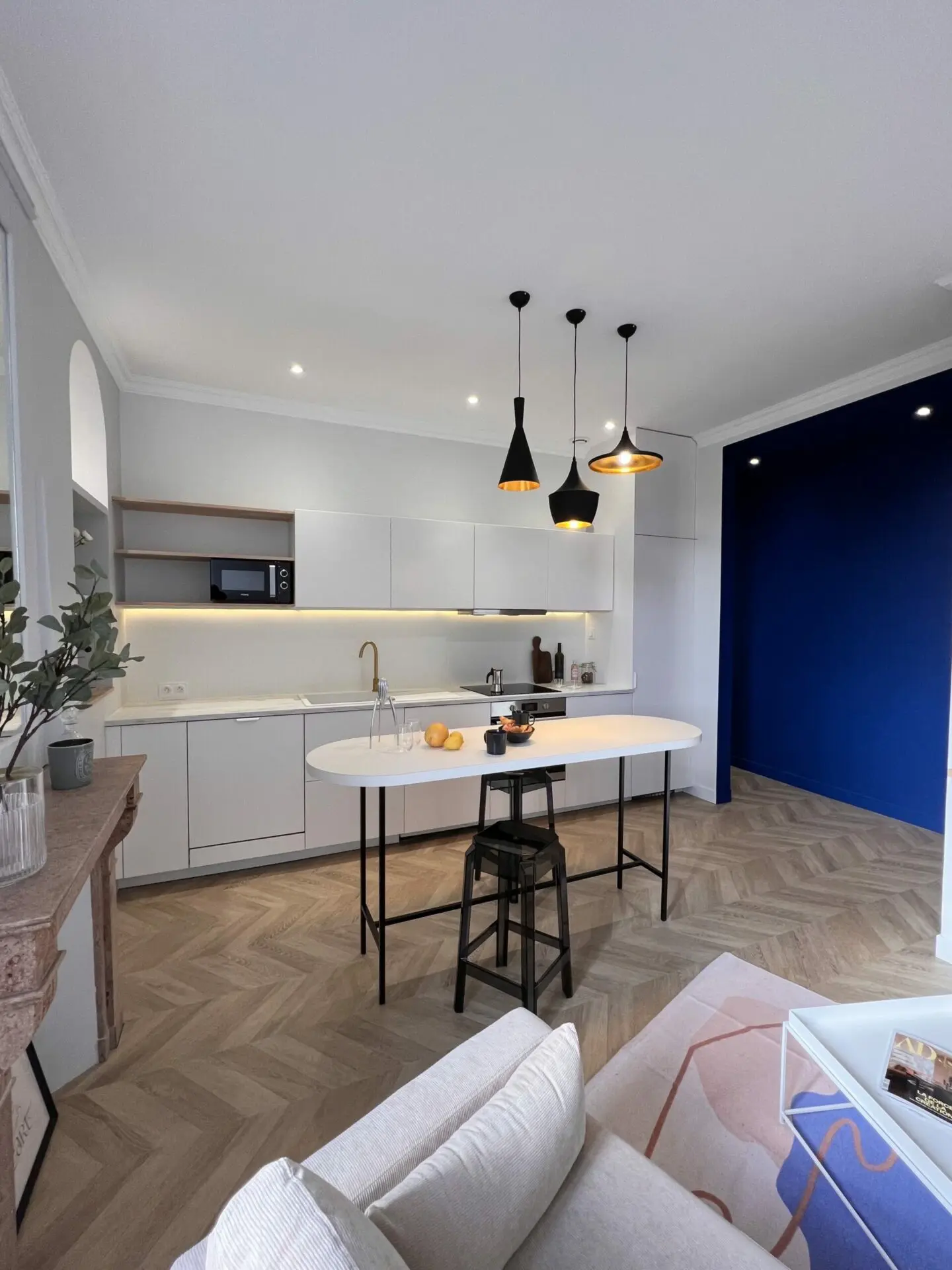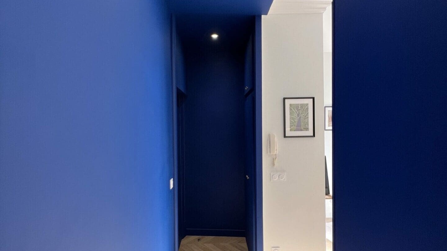 Un design chic, sophistiqué avec quelques éléments impactants comme la couleur bleu de couloir ont été les lignes directrices du projet.