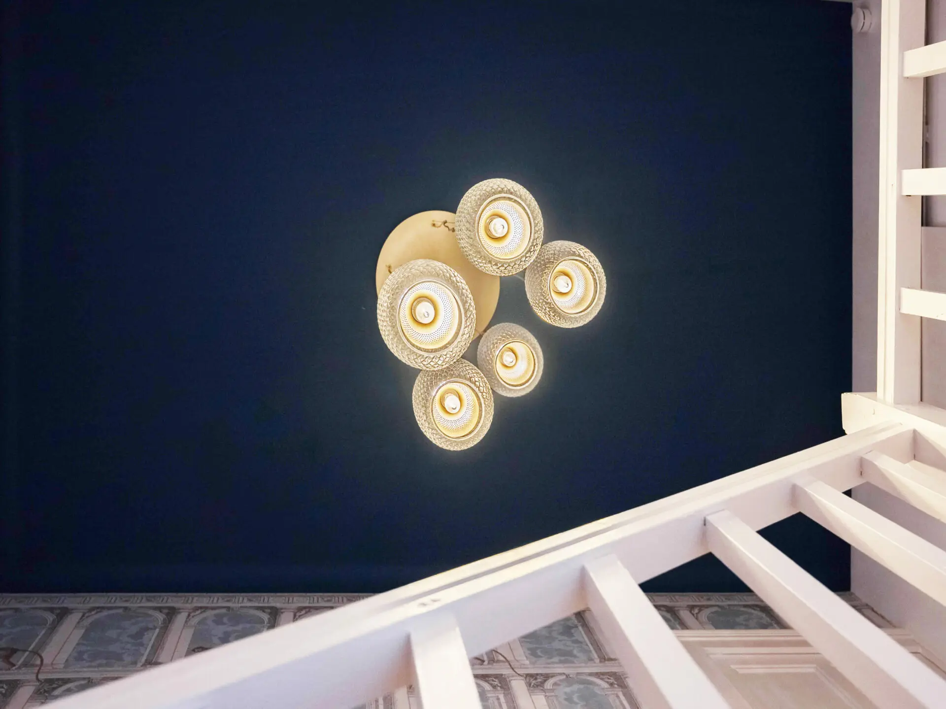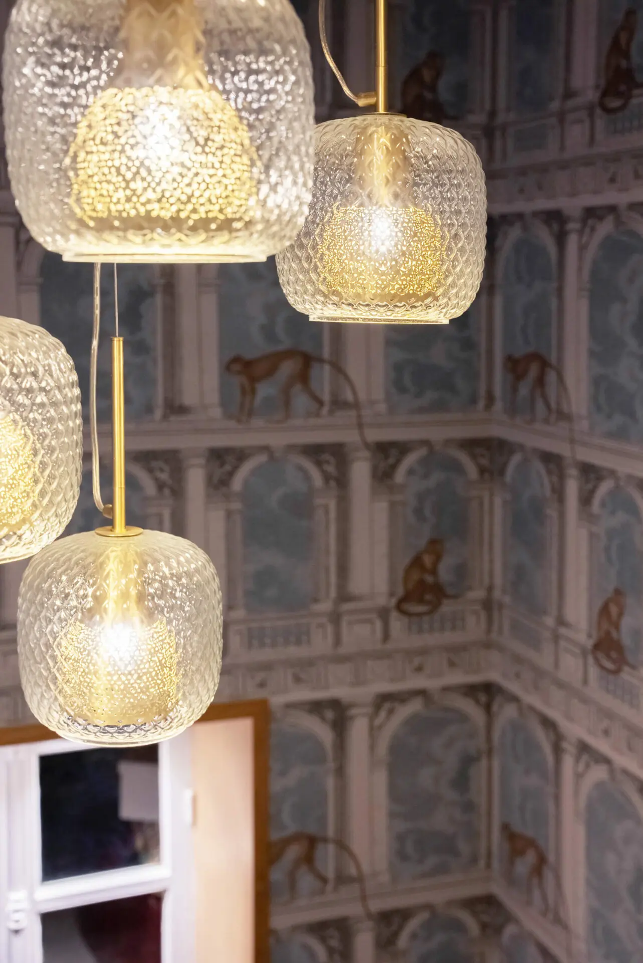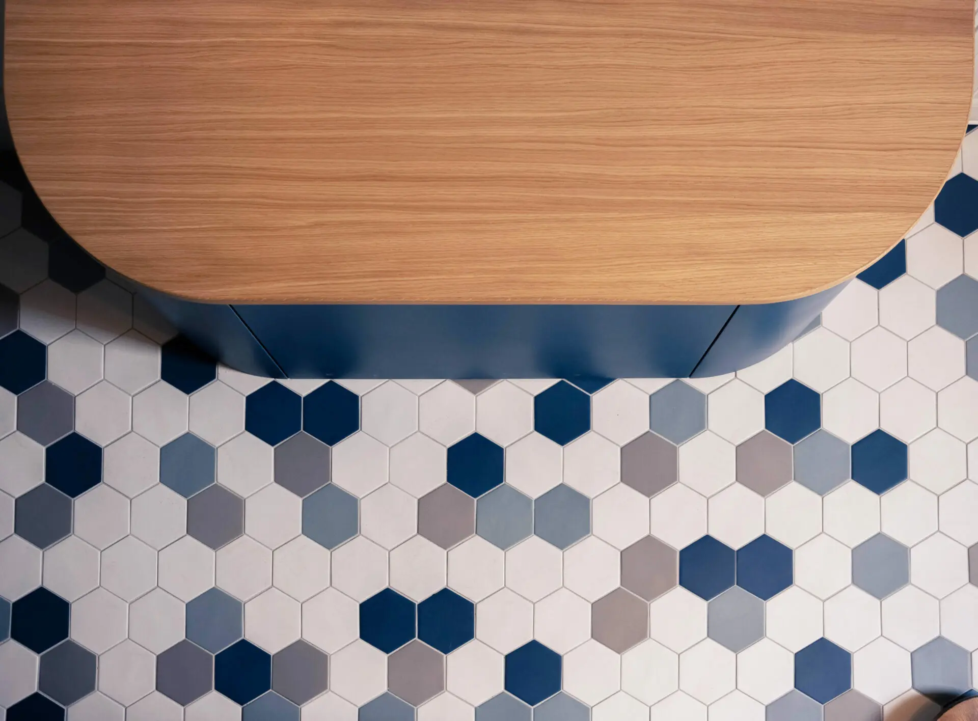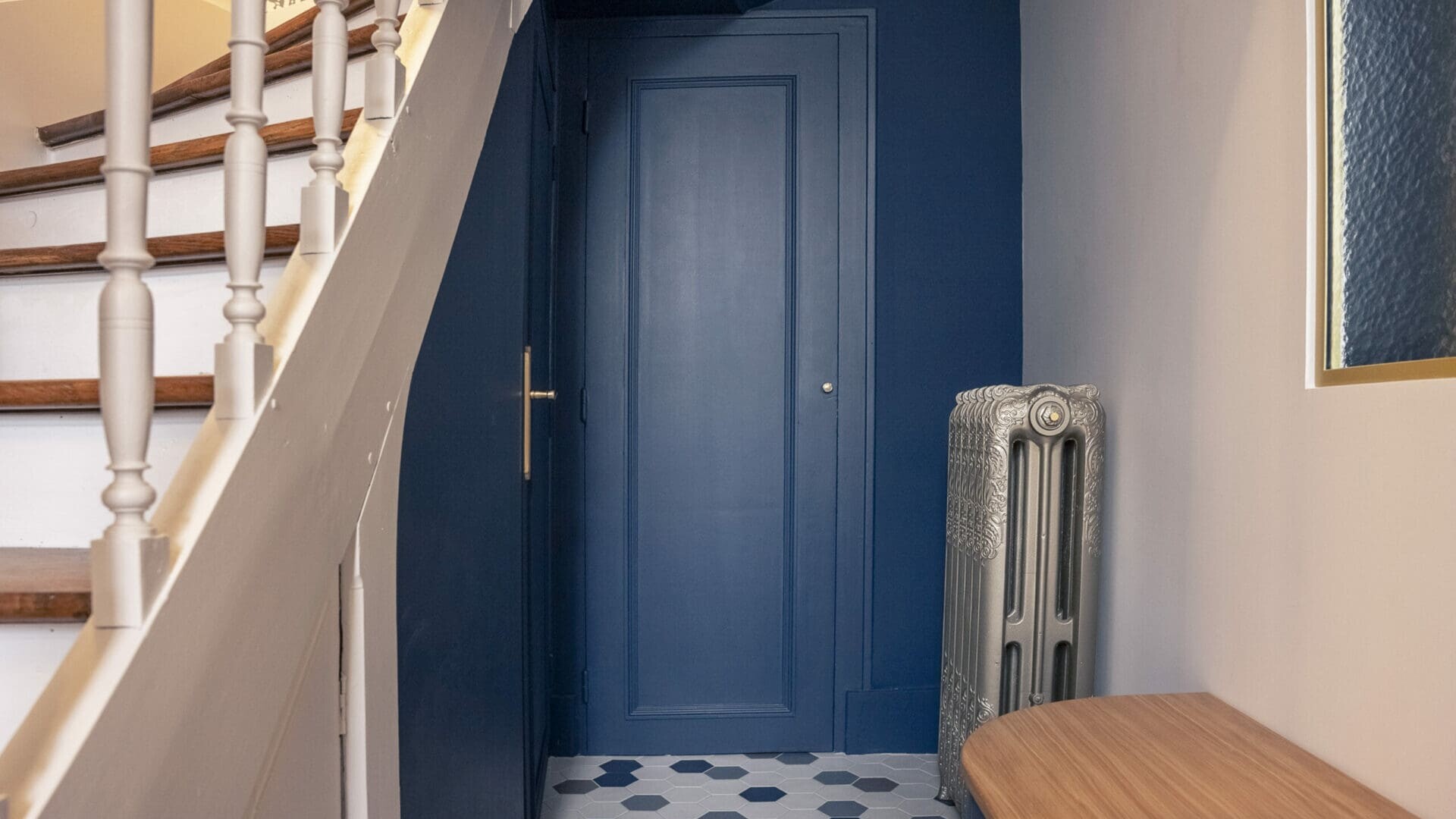 Nous avons jouer avec les nuances de bleu entre la peinture, le carrelage et les papiers peints