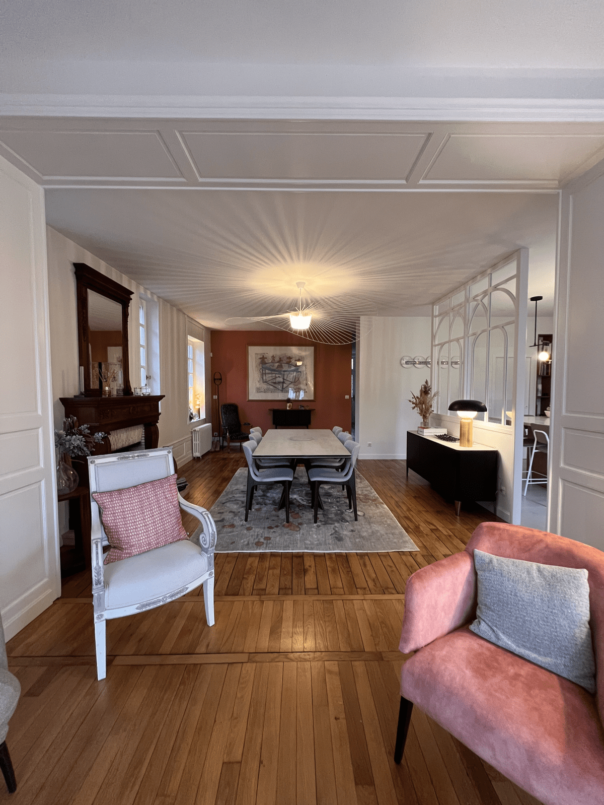 Une verrière vient délimiter et décorer le lien entre la cuisine et la salle à manger.