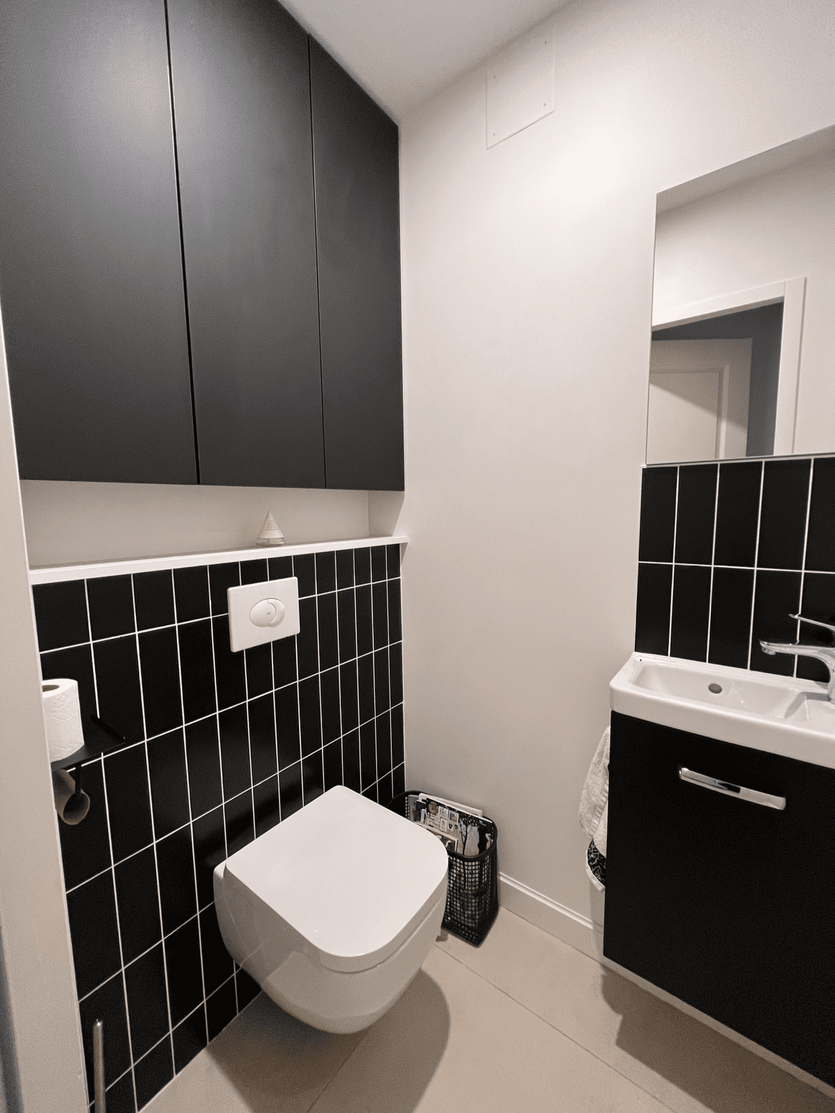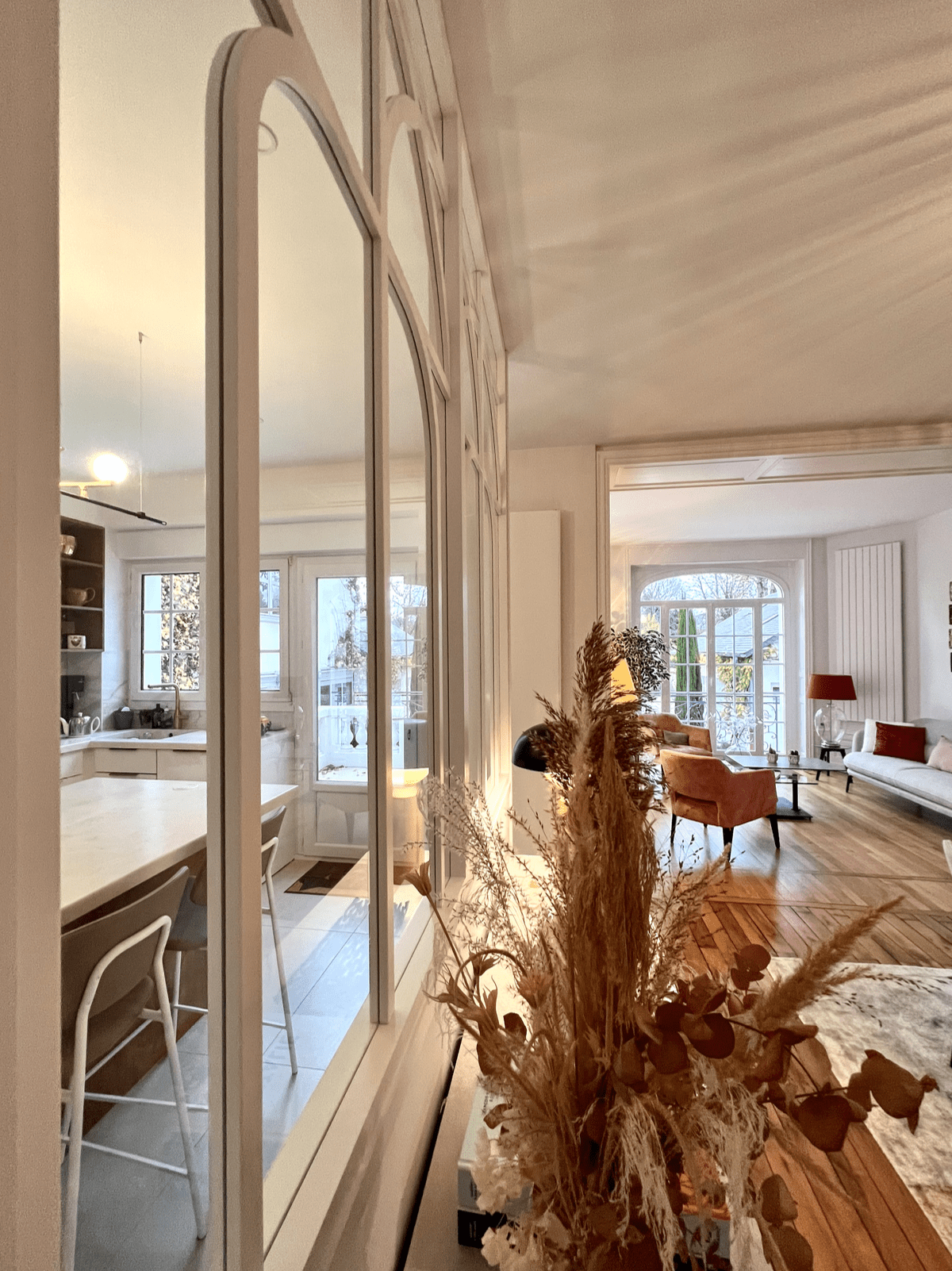 Nous avons imaginé une vraie entrée en proposant un meuble sur mesure où sa fonction de cloisonnement visuel est optimisée par des rangements. Un grand miroir au décor art déco vient accentuer le charme de cet espace.